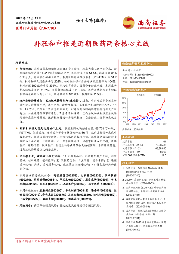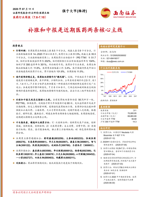 【西南证券】【20200711】医药行业周报:补涨和中报是近期医药两条核心主线-24页