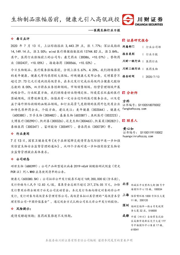 【川财证券】【20200713】医药生物行业日报:生物制品涨幅居前,健康元引入高瓴战投-3页