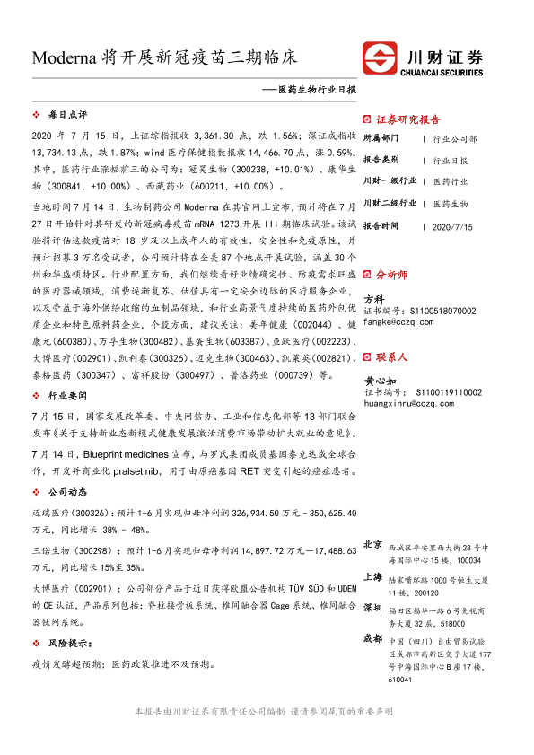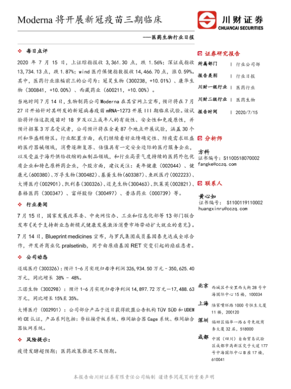 【川财证券】【20200715】医药生物行业日报:Moderna将开展新冠疫苗三期临床-3页