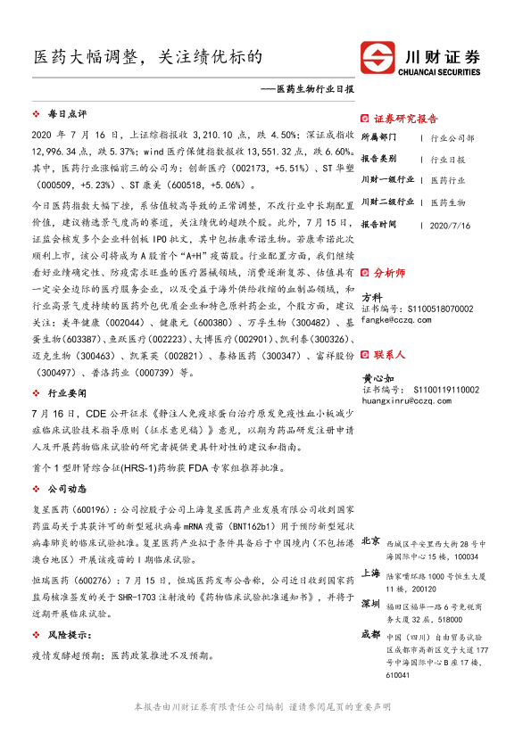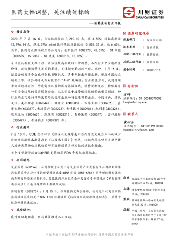 【川财证券】【20200716】医药生物行业日报:医药大幅调整,关注绩优标的-3页