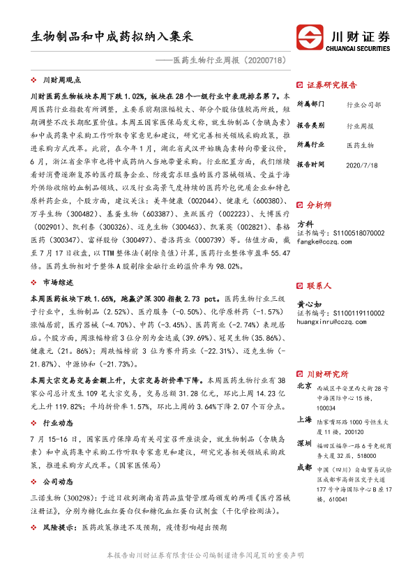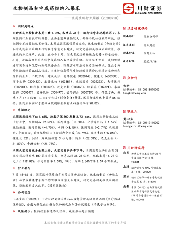 【川财证券】【20200718】医药生物行业周报:生物制品和中成药拟纳入集采-15页