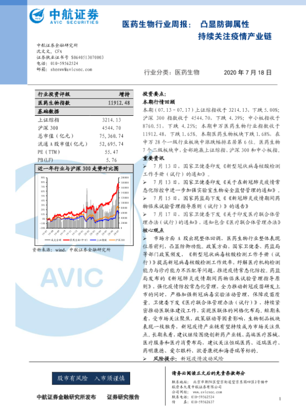 【中航证券】【20200718】医药生物行业周报:凸显防御属性 持续关注疫情产业链-10页