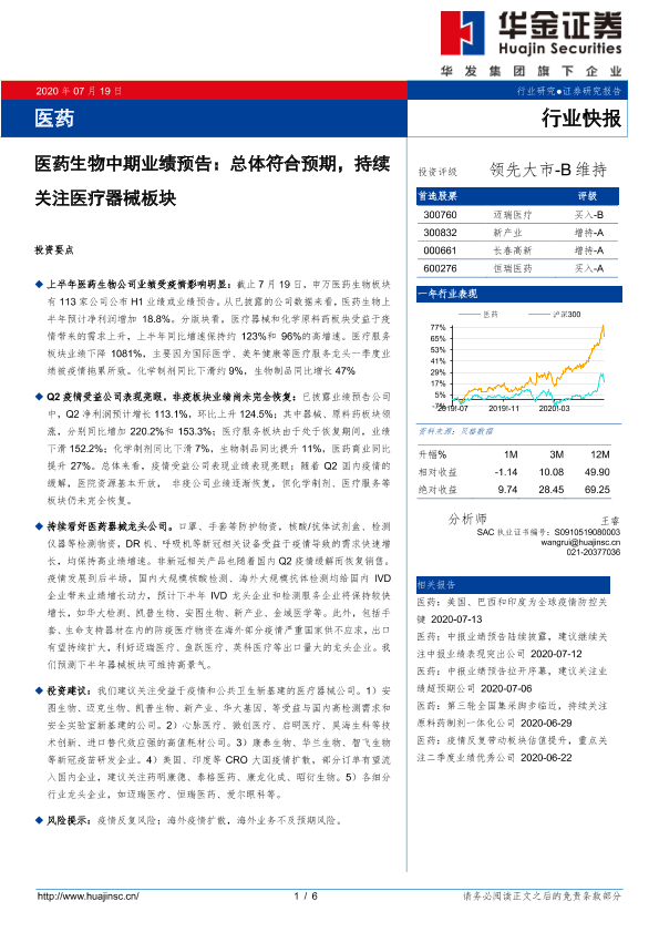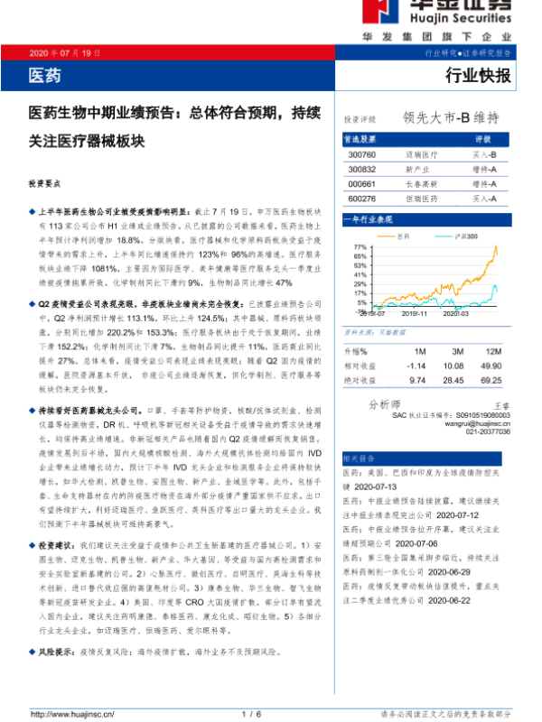 【华金证券】【20200719】医药生物中期业绩预告:总体符合预期,持续关注医疗器械板块-6页