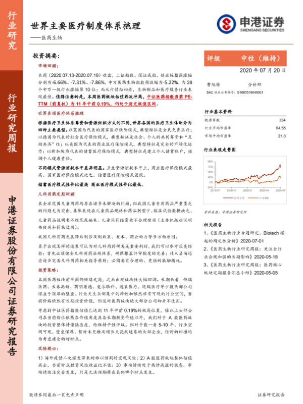 【申港证券】【20200720】医药生物行业研究周报:世界主要医疗制度体系梳理-15页