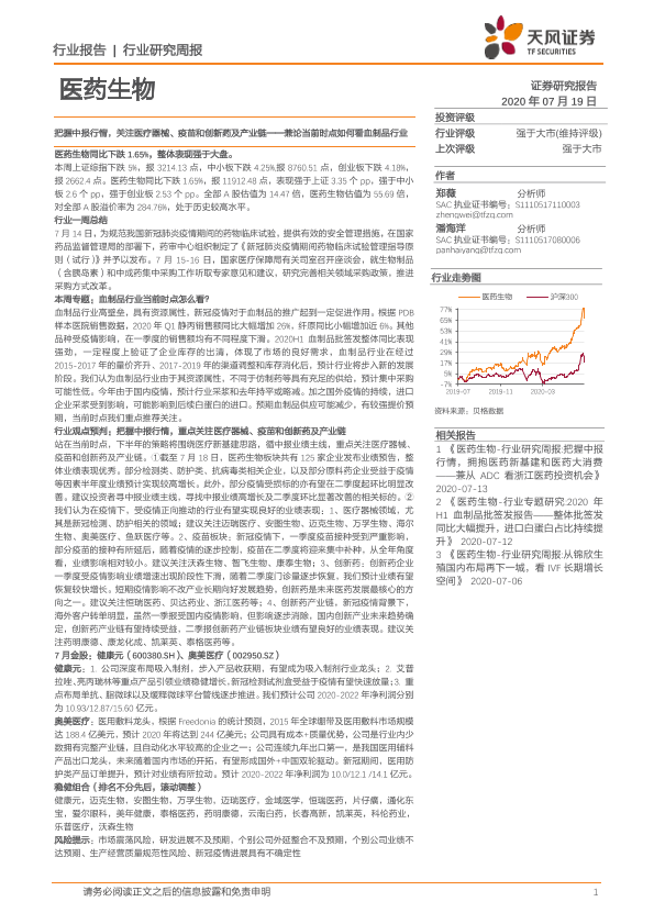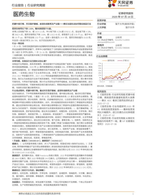 【天风证券】【20200719】把握中报行情,关注医疗器械、疫苗和创新药及产业链——兼论当前时点如何看血制品行业-26页