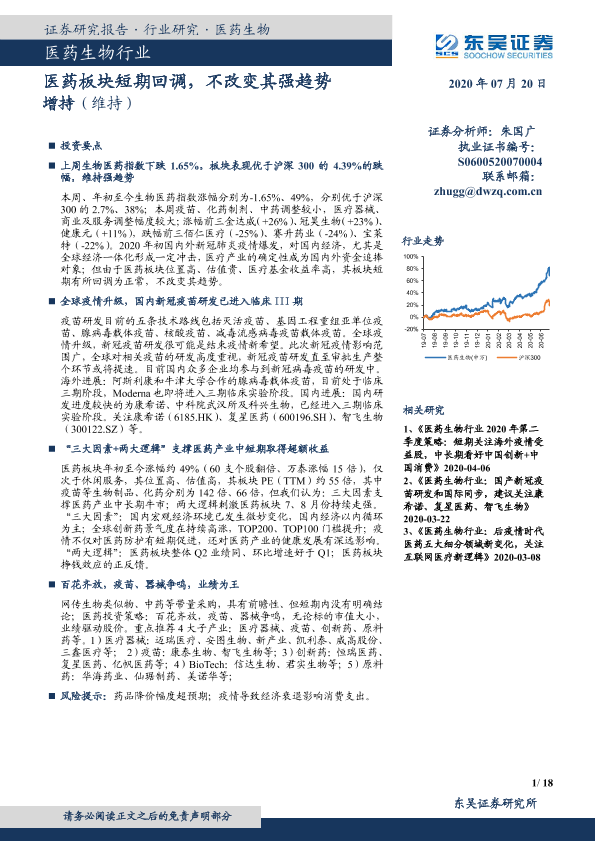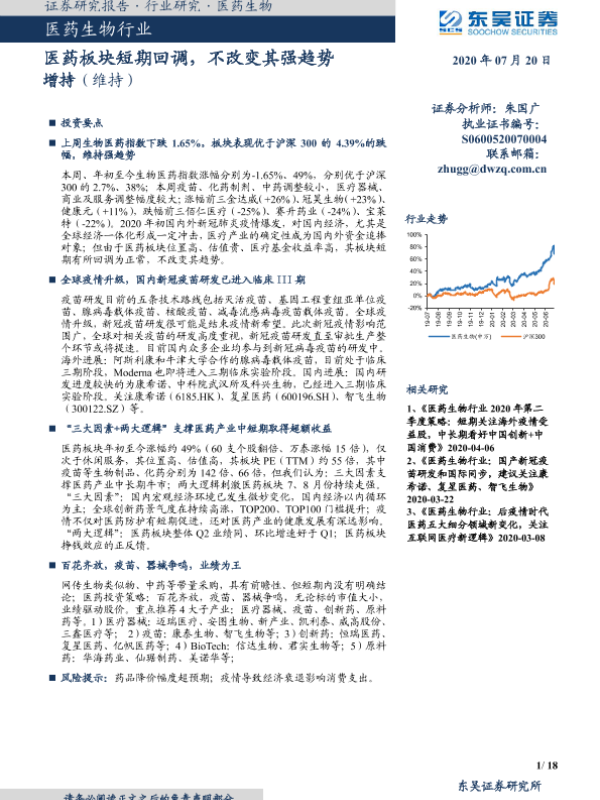 【东吴证券】【20200720】医药生物行业:医药板块短期回调,不改变其强趋势-18页