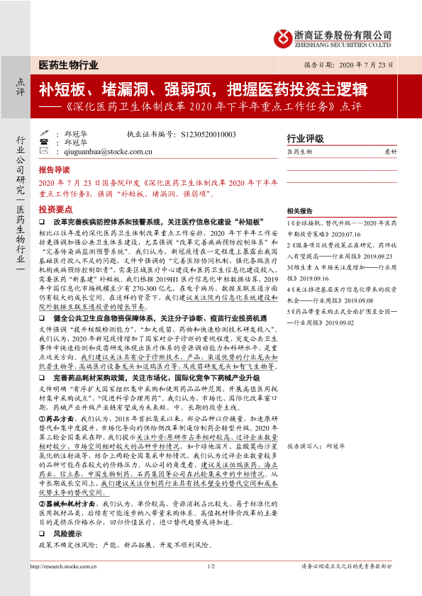【浙商证券】【20200723】深化医药卫生体制改革2020年下半年重点工作任务点评-2页