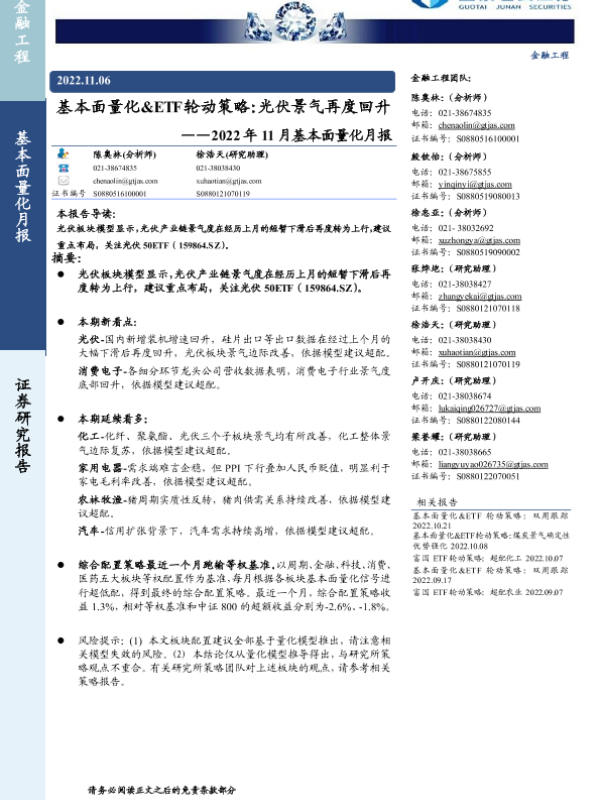 【国泰君安证券】【20221106】2022年11月基本面量化月报:基本面量化&ETF轮动策略,光伏景气再度回升-28页