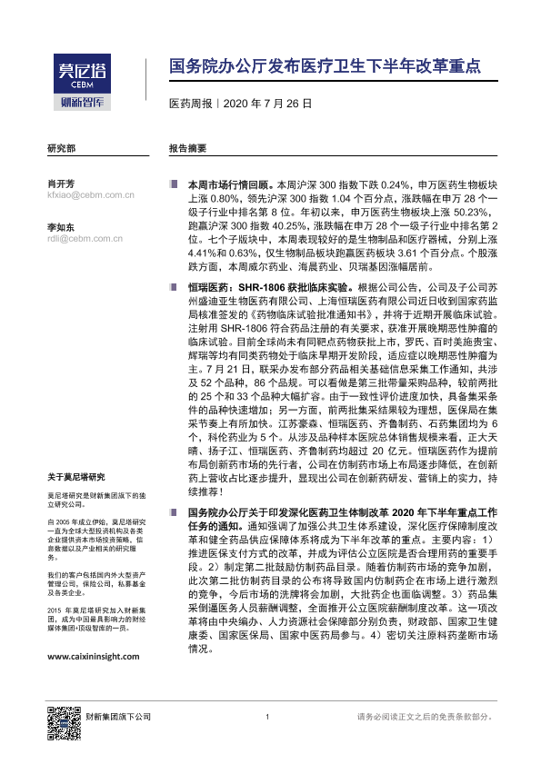 【莫尼塔研究】【20200726】医药周报:国务院办公厅发布医疗卫生下半年改革重点-7页