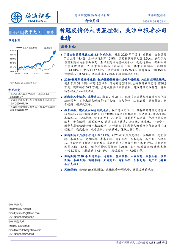 【海通证券】【20200802】医药与健康护理行业月报:新冠疫情仍未明显控制,关注中报季公司业绩-5页
