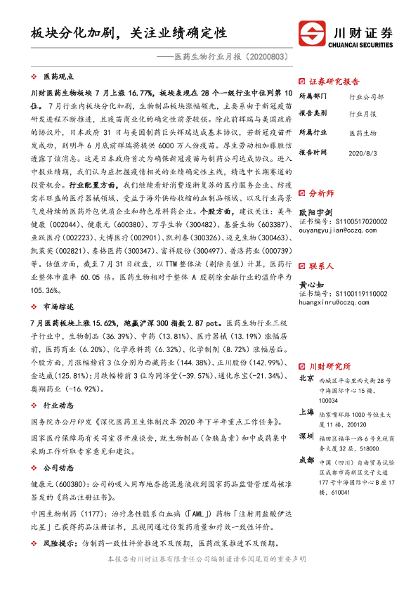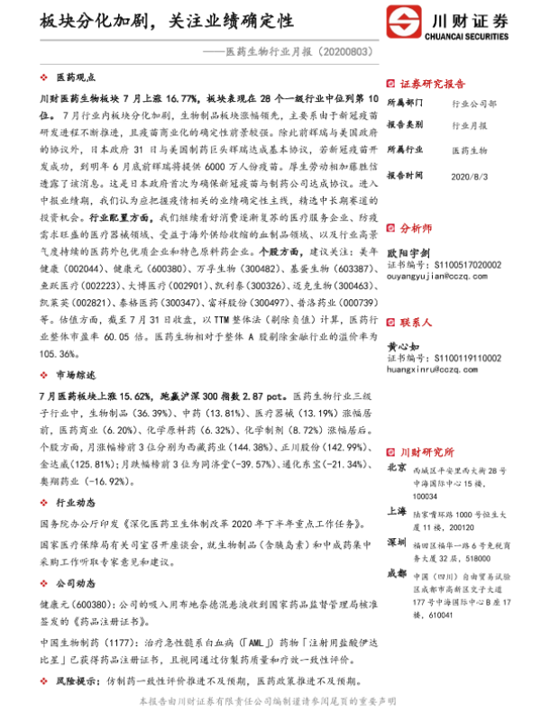 【川财证券】【20200803】医药生物行业月报:板块分化加剧,关注业绩确定性-14页