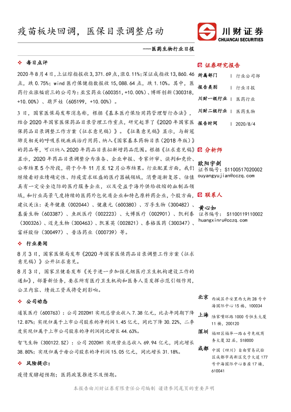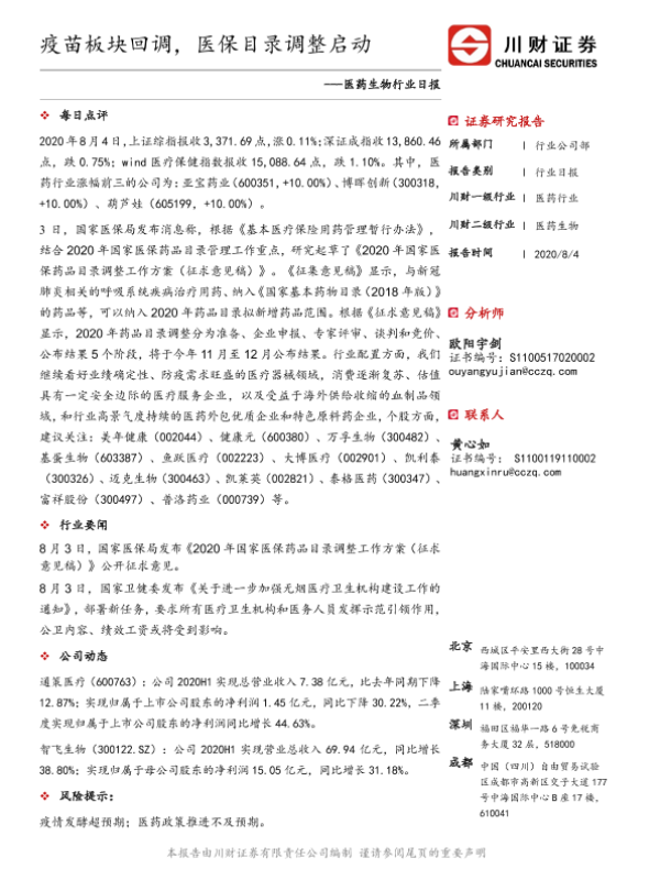 【川财证券】【20200804】医药生物行业日报:疫苗板块回调,医保目录调整启动-3页
