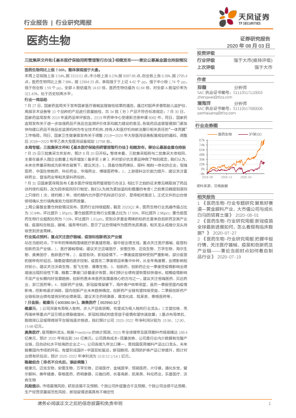 【天风证券】【20200803】医药生物行业研究周报:三批集采文件和《基本医疗保险用药管理暂行办法》相继发布——兼论公募基金重仓持股情况-21页