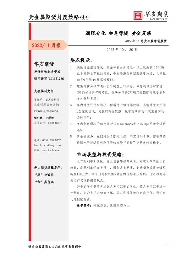 【华安期货】【20221030】2022年11月贵金属市场展望:通胀分化,加息暂缓,黄金震荡-17页