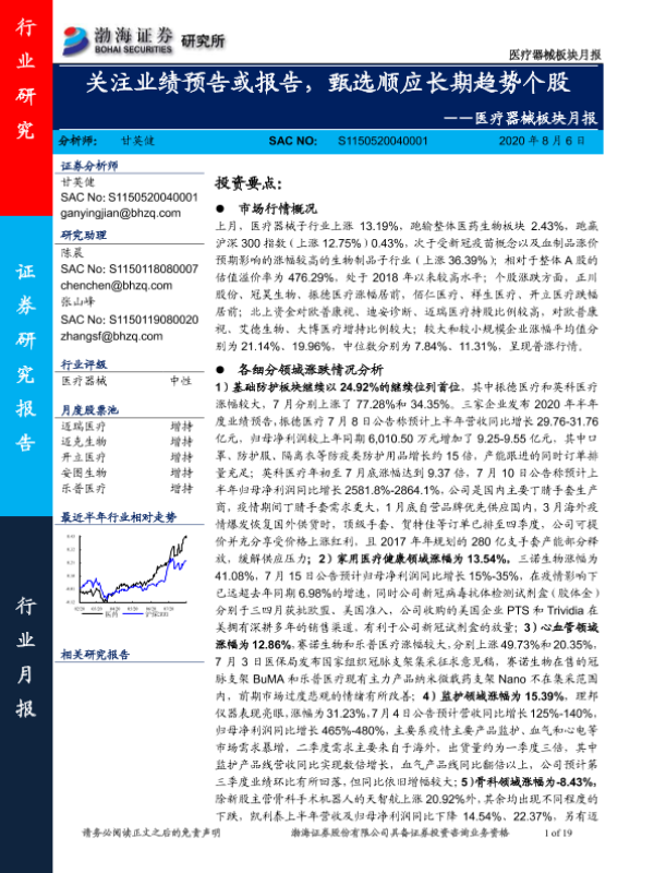 【渤海证券】【20200806】医疗器械板块月报:关注业绩预告或报告,甄选顺应长期趋势个股-19页