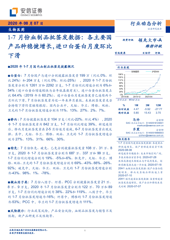 【安信证券】【20200807】1-7月份血制品批签发数据:各主要国产品种稳健增长,进口白蛋白月度环比下滑-11页