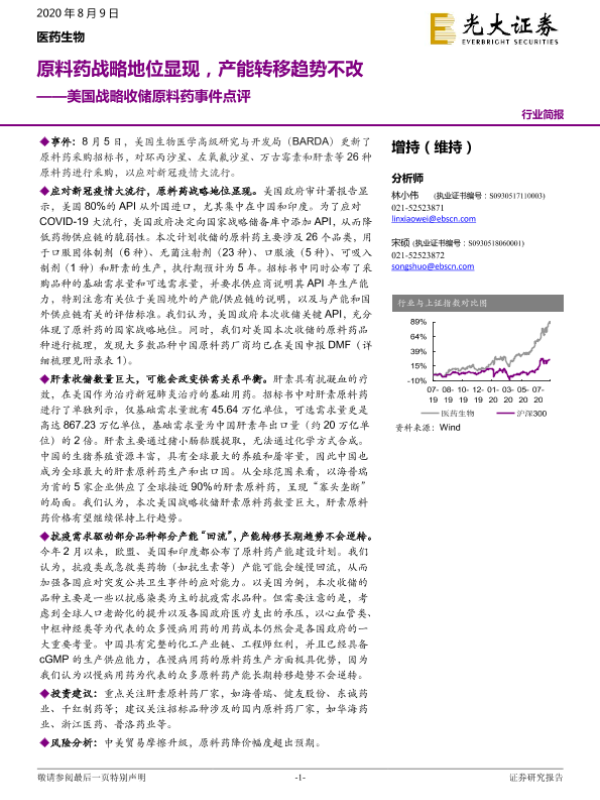 【光大证券】【20200809】美国战略收储原料药事件点评:原料药战略地位显现,产能转移趋势不改-4页