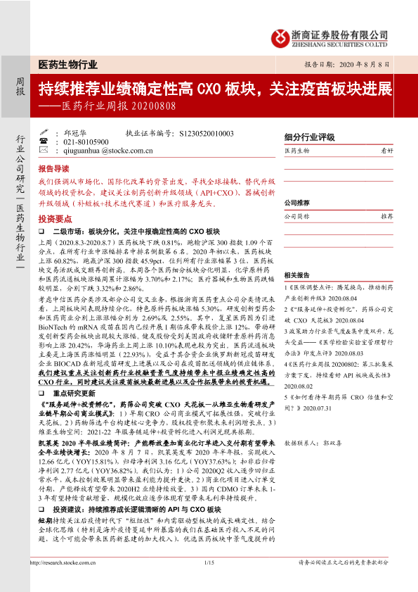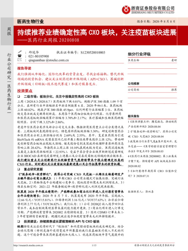 【浙商证券】【20200808】医药行业周报:持续推荐业绩确定性高CXO板块,关注疫苗板块进展-15页