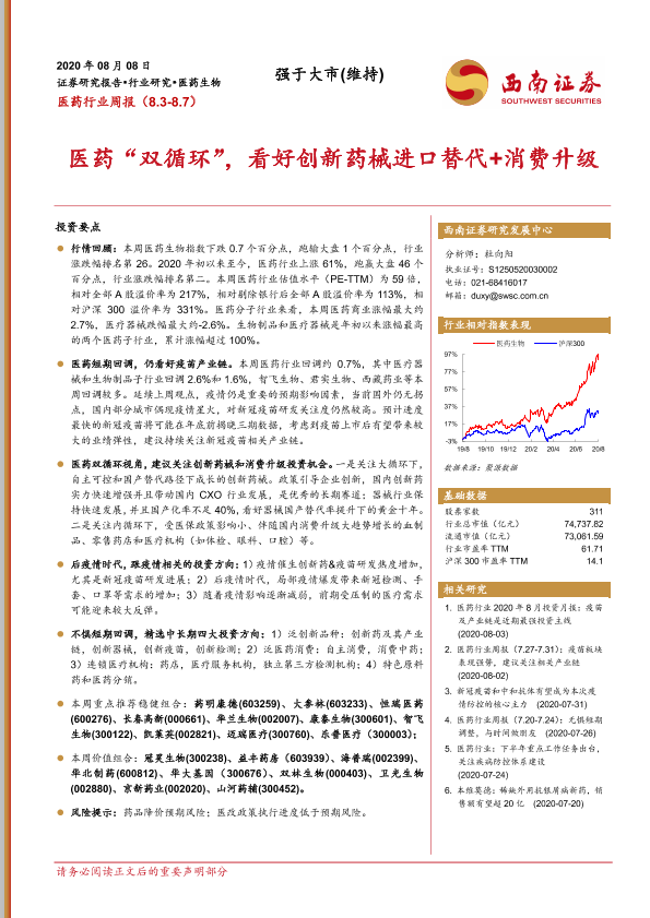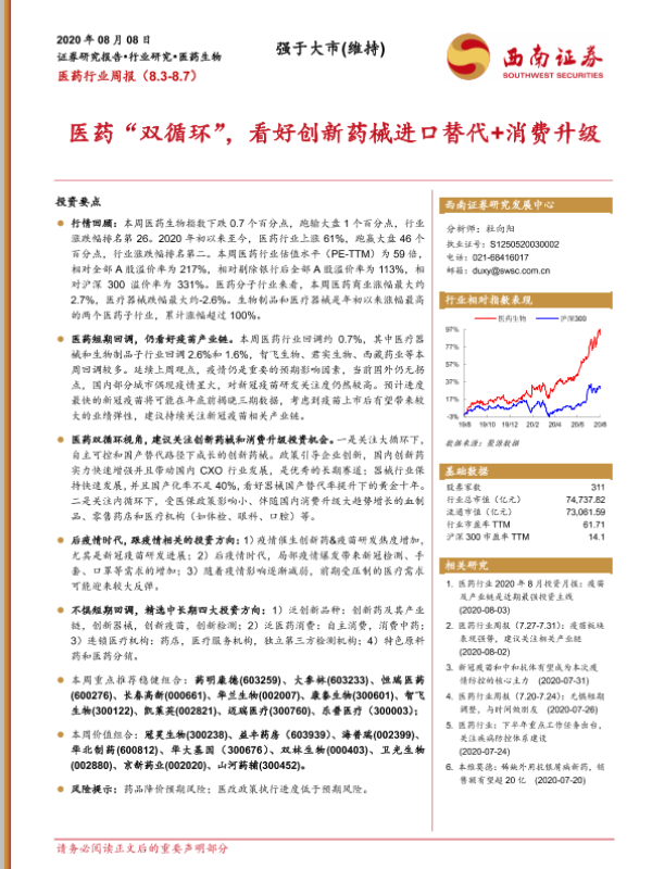 【西南证券】【20200808】医药行业周报:医药“双循环”,看好创新药械进口替代+消费升级-23页