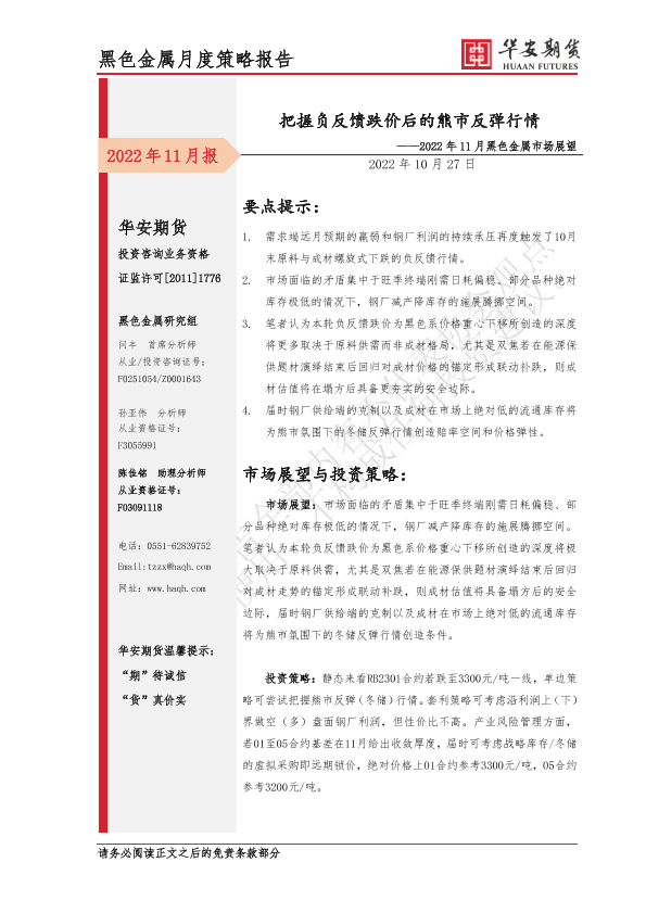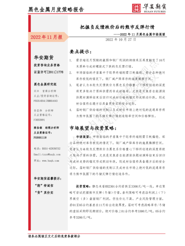 【华安期货】【20221027】2022年11月黑色金属市场展望:把握负反馈跌价后的熊市反弹行情-20页