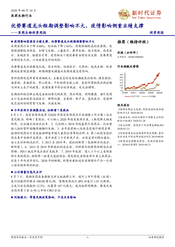 【新时代证券】【20200810】医药生物投资周报:优势赛道龙头短期调整影响不大,疫情影响侧重业绩支撑-21页