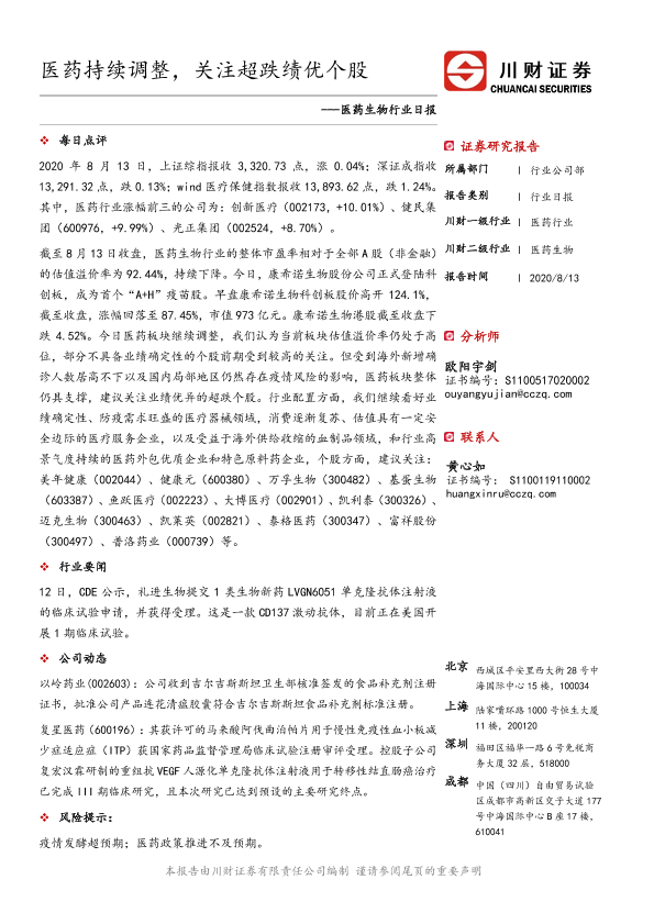 【川财证券】【20200813】医药生物行业日报:医药持续调整,关注超跌绩优个股-3页