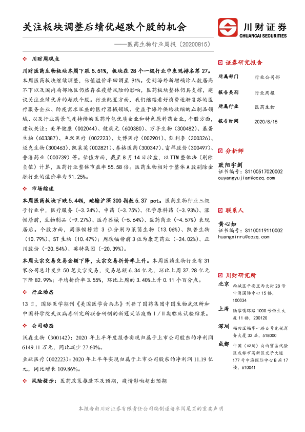 【川财证券】【20200815】医药生物行业周报:关注板块调整后绩优超跌个股的机会-14页