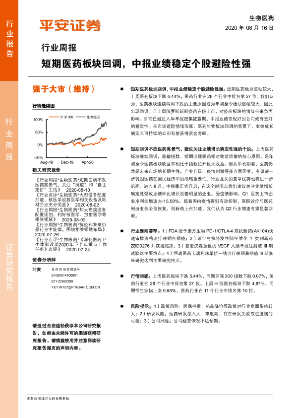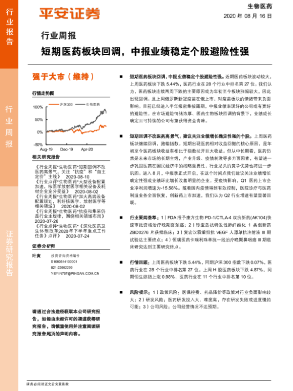 【平安证券】【20200816】生物医药行业周报:短期医药板块回调,中报业绩稳定个股避险性强-6页