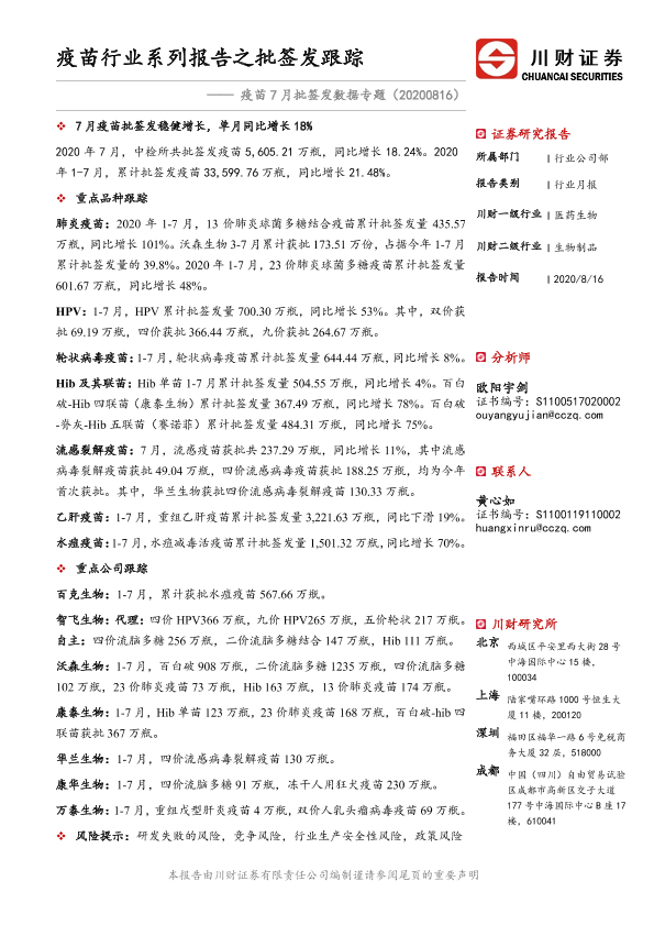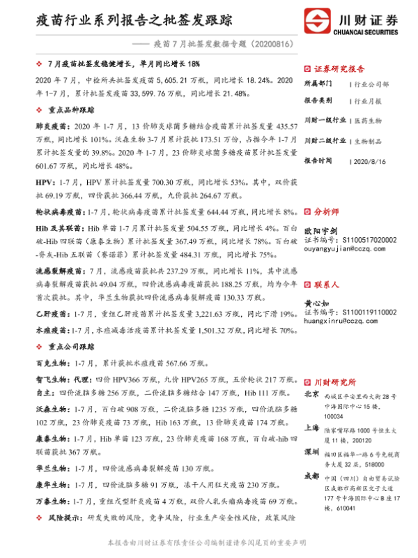【川财证券】【20200816】疫苗7月批签发数据专题:疫苗行业系列报告之批签发跟踪-16页