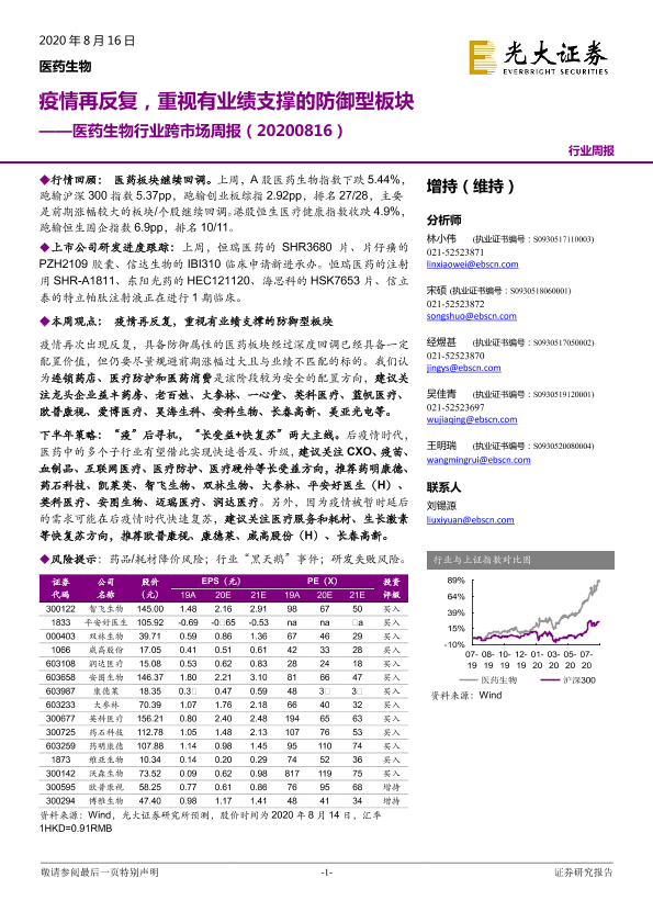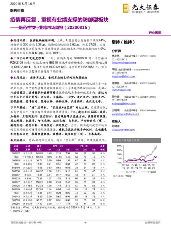 【光大证券】【20200816】医药生物行业跨市场周报:疫情再反复,重视有业绩支撑的防御型板块-36页