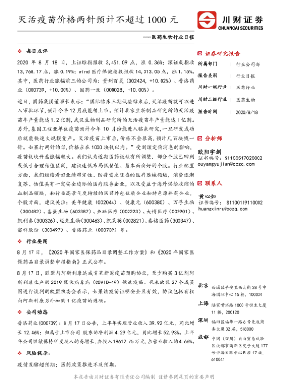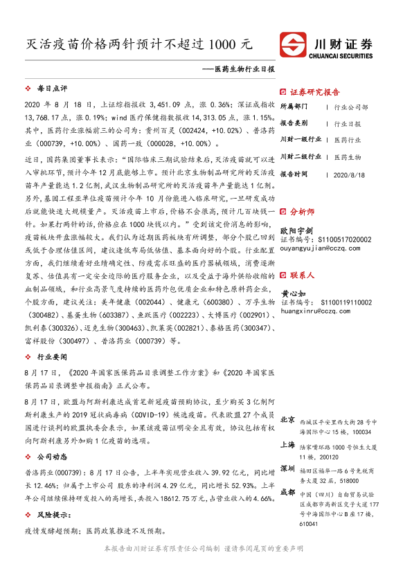 【川财证券】【20200818】医药生物行业日报:灭活疫苗价格两针预计不超过1000元-3页