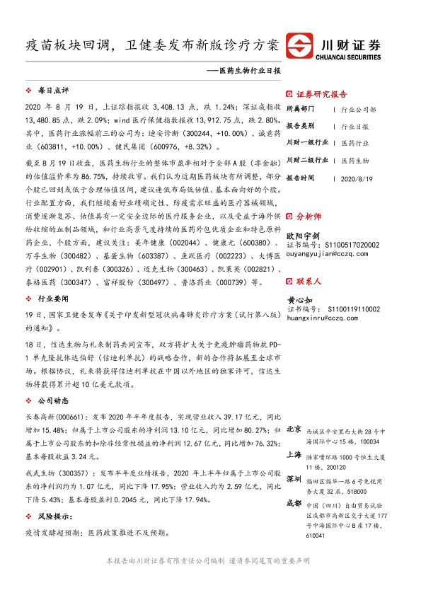 【川财证券】【20200819】医药生物行业日报:疫苗板块回调,卫健委发布新版诊疗方案-3页