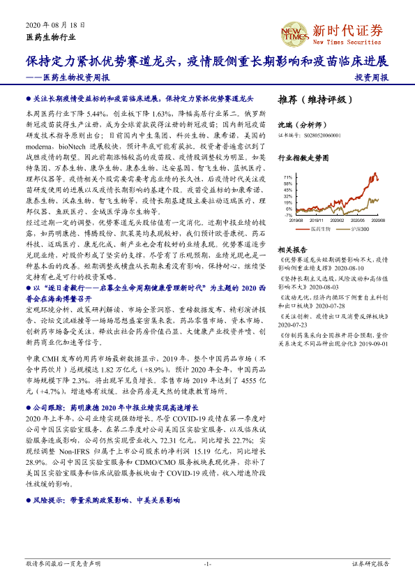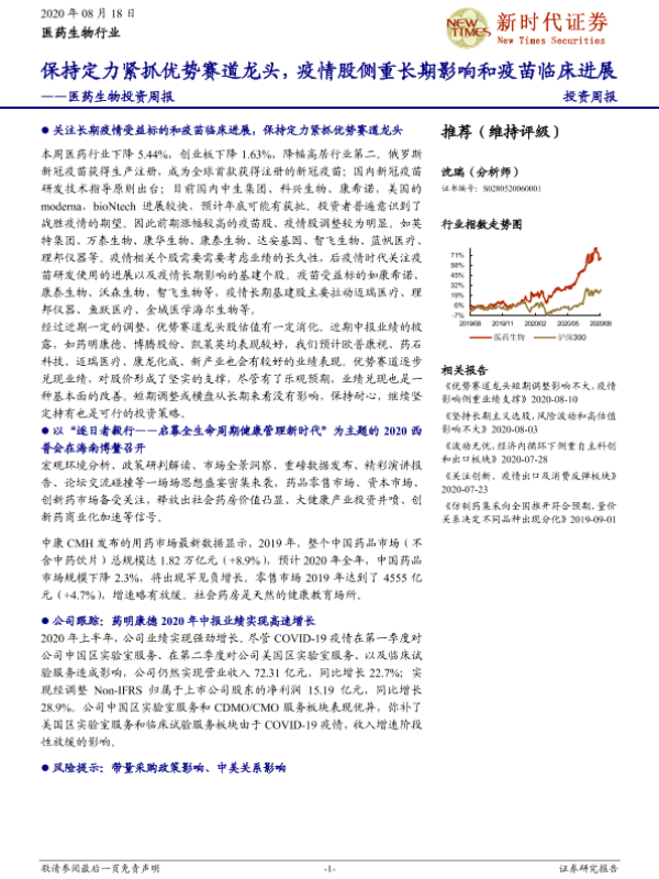 【新时代证券】【20200818】医药生物投资周报:保持定力紧抓优势赛道龙头,疫情股侧重长期影响和疫苗临床进展-22页