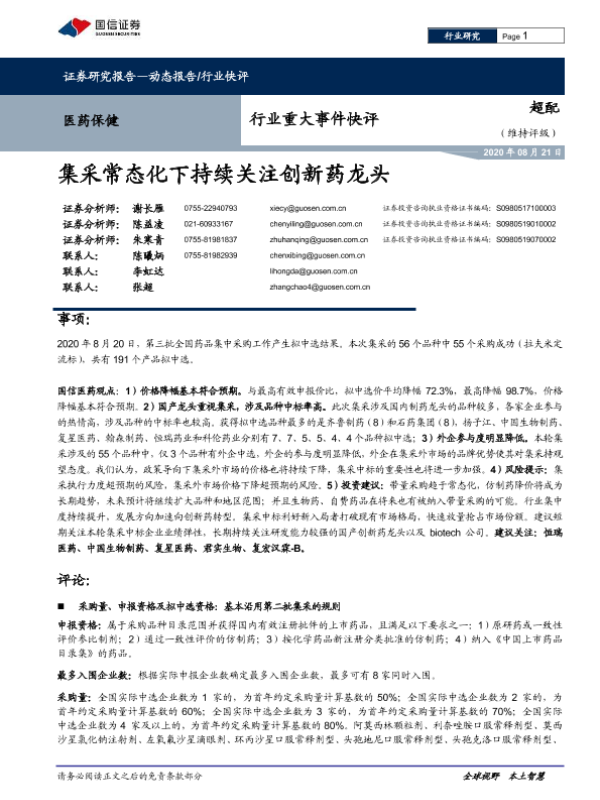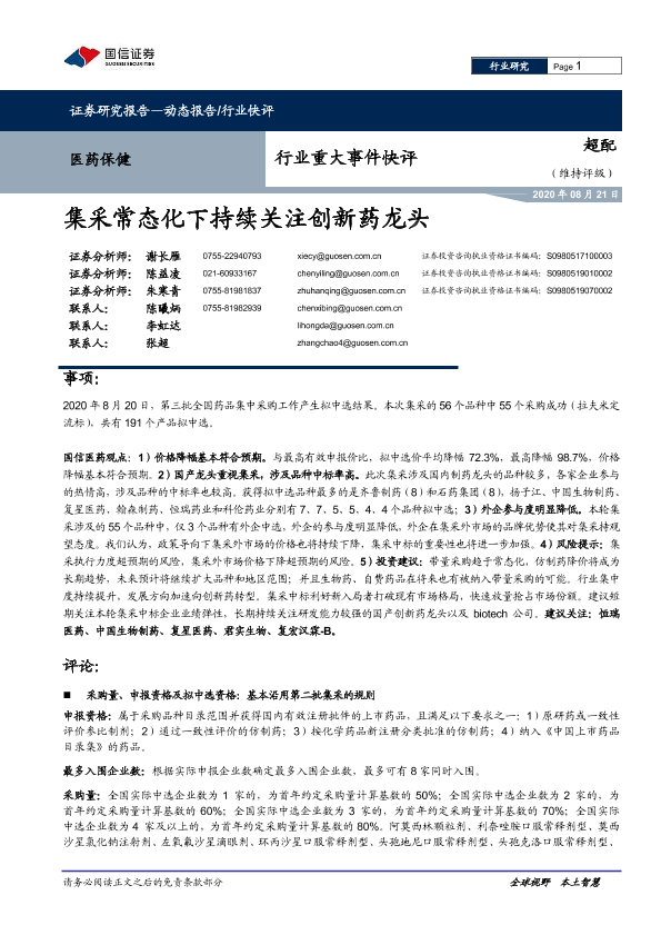 【国信证券】【20200821】医药保健行业重大事件快评:集采常态化下持续关注创新药龙头-12页