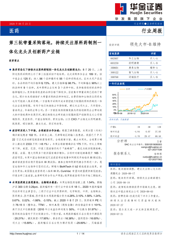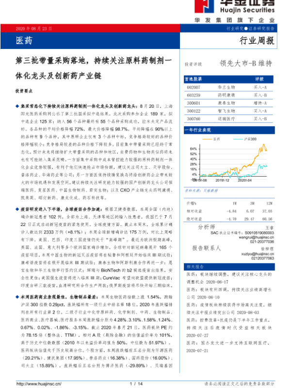 【华金证券】【20200823】医药行业周报:第三批带量采购落地,持续关注原料药制剂一体化龙头及创新药产业链-14页