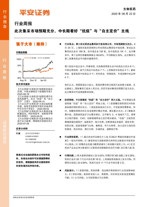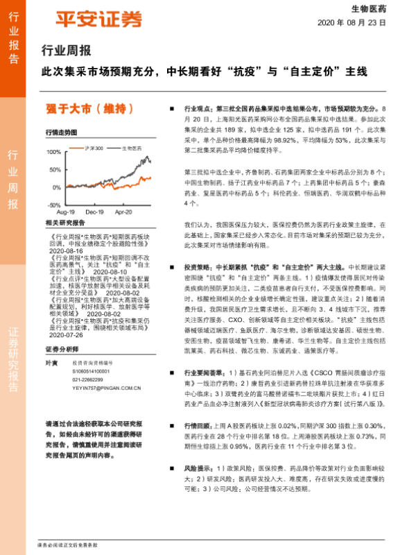 【平安证券】【20200823】生物医药行业周报:此次集采市场预期充分,中长期看好“抗疫”与“自主定价”主线-6页