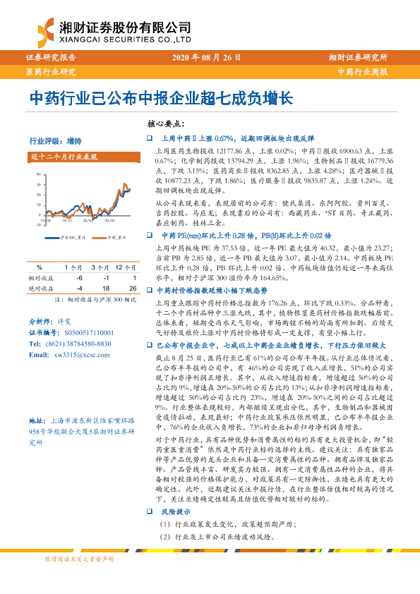【湘财证券】【20200826】中药行业已公布中报企业超七成负增长-11页