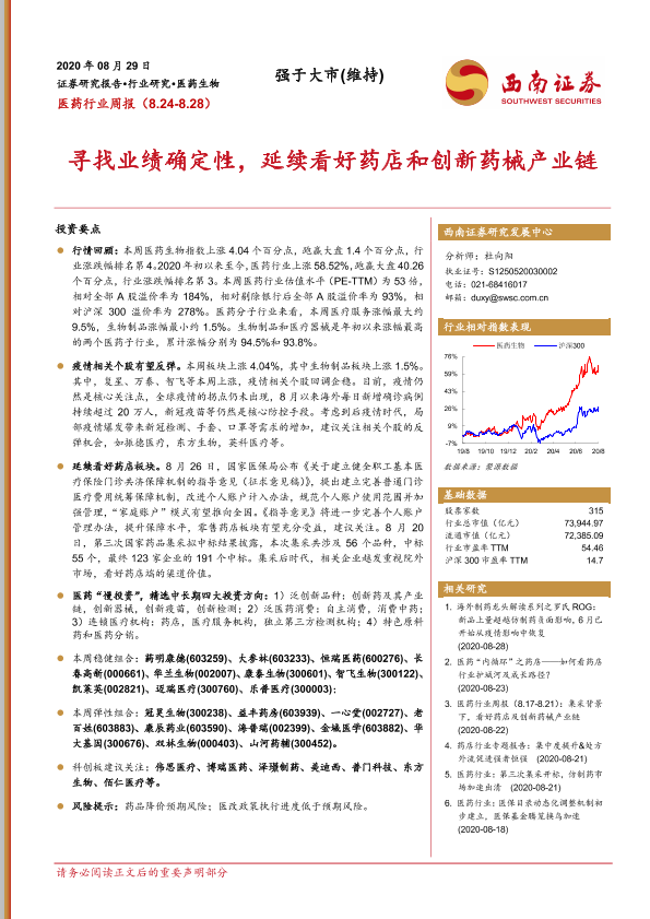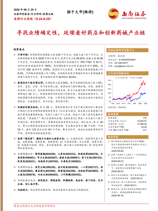 【西南证券】【20200829】医药行业周报:寻找业绩确定性,延续看好药店和创新药械产业链-24页