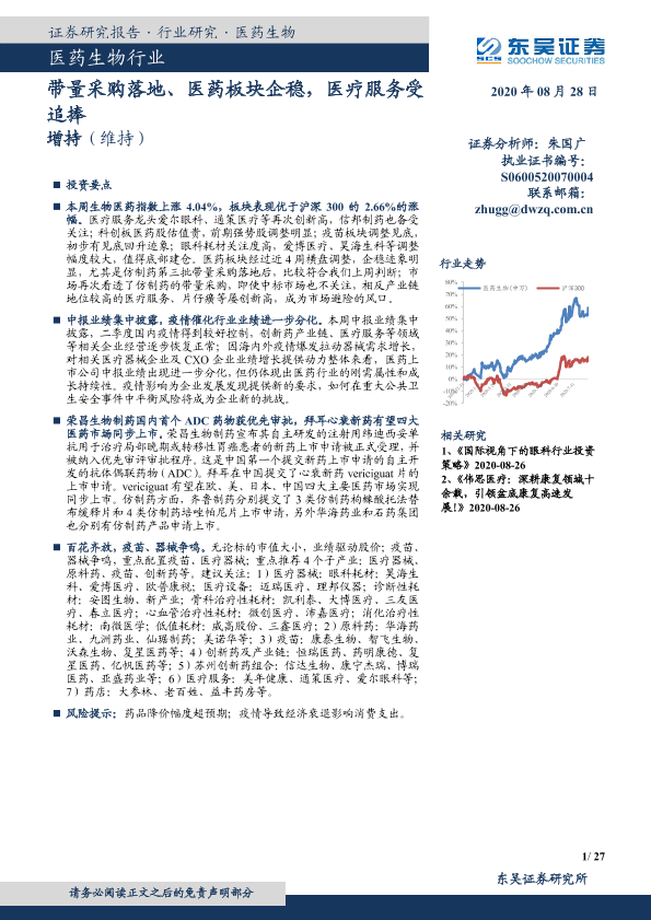 【东吴证券】【20200828】医药生物行业:带量采购落地、医药板块企稳,医疗服务受追捧-27页