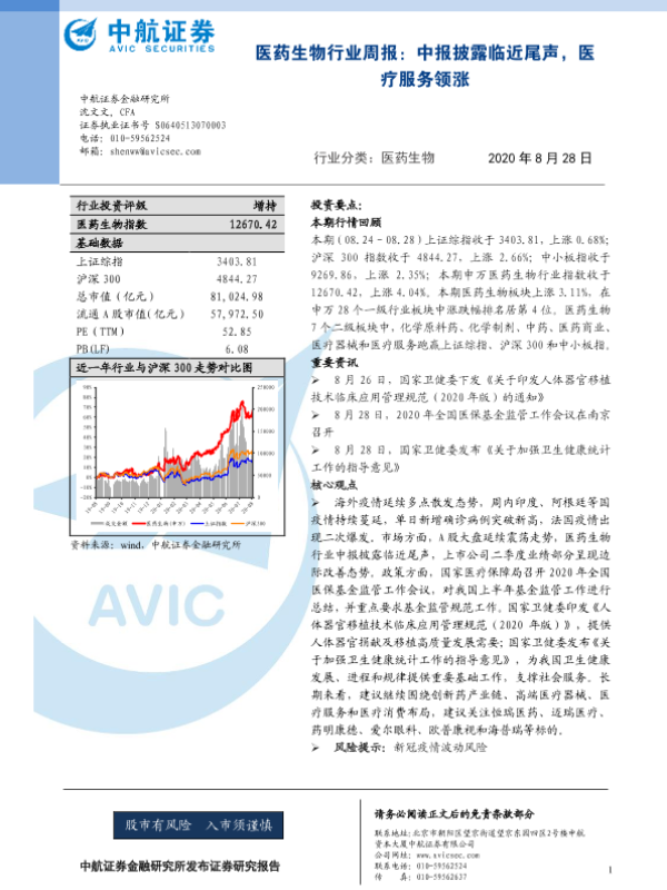 【中航证券】【20200828】医药生物行业周报:中报披露临近尾声,医疗服务领涨-10页