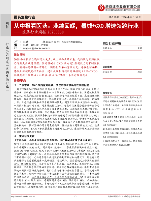 【浙商证券】【20200830】从中报看医药:业绩回暖,器械+CXO增速领跑行业-21页
