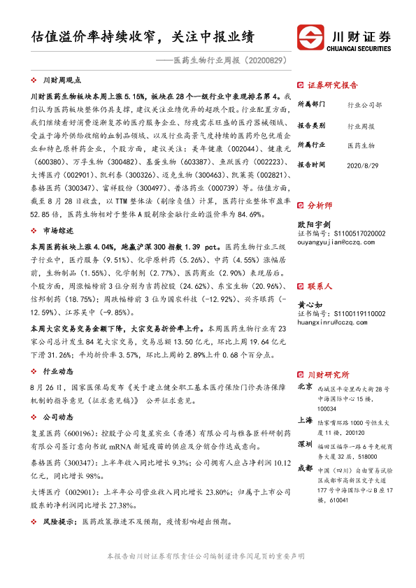 【川财证券】【20200829】医药生物行业周报:估值溢价率持续收窄,关注中报业绩-14页
