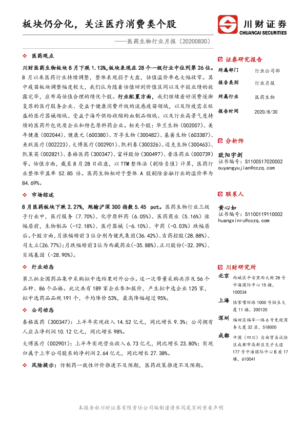 【川财证券】【20200830】医药生物行业月报:板块仍分化,关注医疗消费类个股-13页
