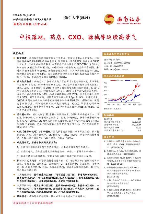 【西南证券】【20200905】医药行业周报:中报落地,药店、CXO、器械等延续高景气-22页