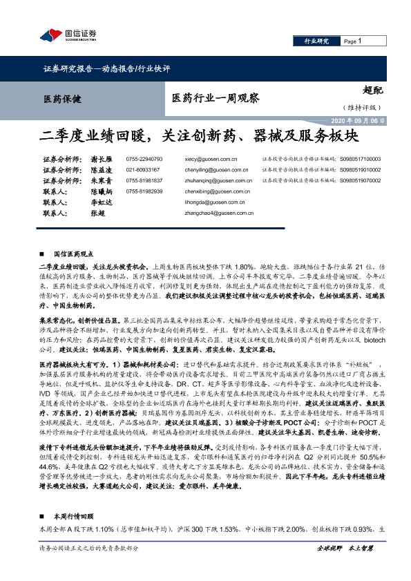 【国信证券】【20200906】医药行业一周观察:二季度业绩回暖,关注创新药、器械及服务板块-8页