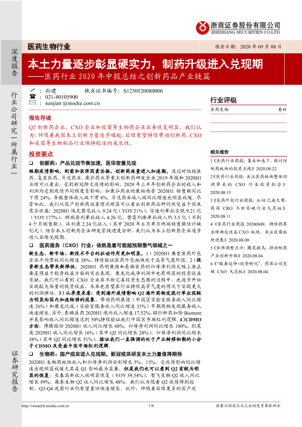 【浙商证券】【20200908】医药行业2020年中报总结之创新药品产业链篇-9页