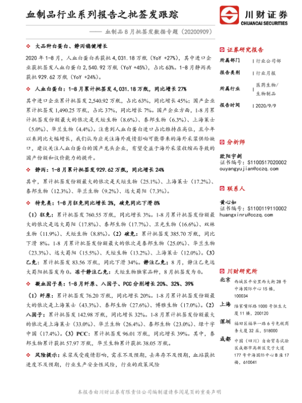 【川财证券】【20200909】血制品8月批签发数据专题:血制品行业系列报告之批签发跟踪-18页