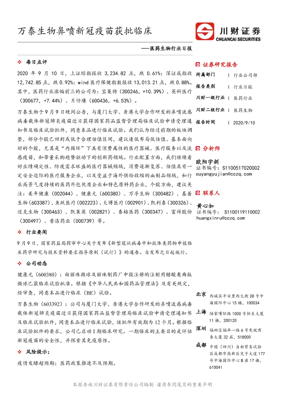 【川财证券】【20200910】医药生物行业日报:万泰生物鼻喷新冠疫苗获批临床-3页