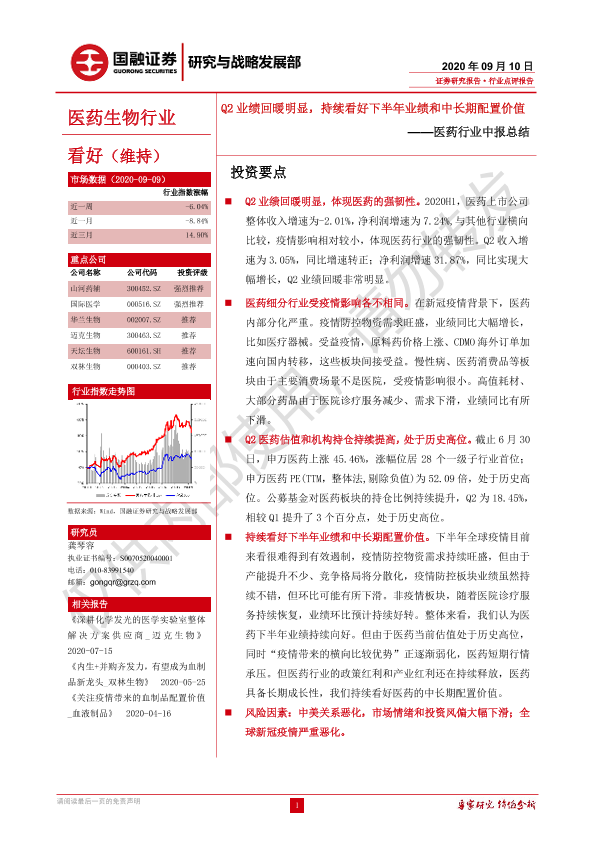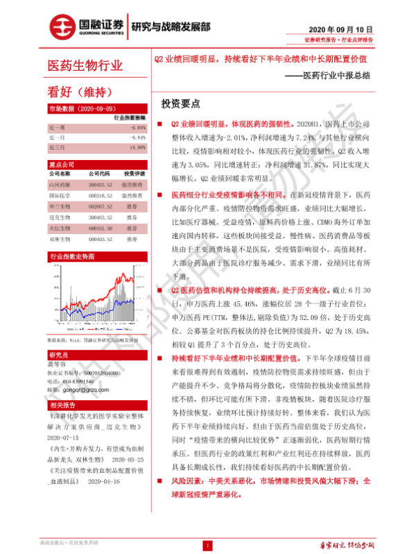 【国融证券】【20200910】医药行业中报总结:Q2业绩回暖明显,持续看好下半年业绩和中长期配置价值-7页