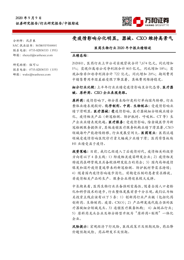 CXO 中报业绩 医疗器械 医药生物 疫情影响